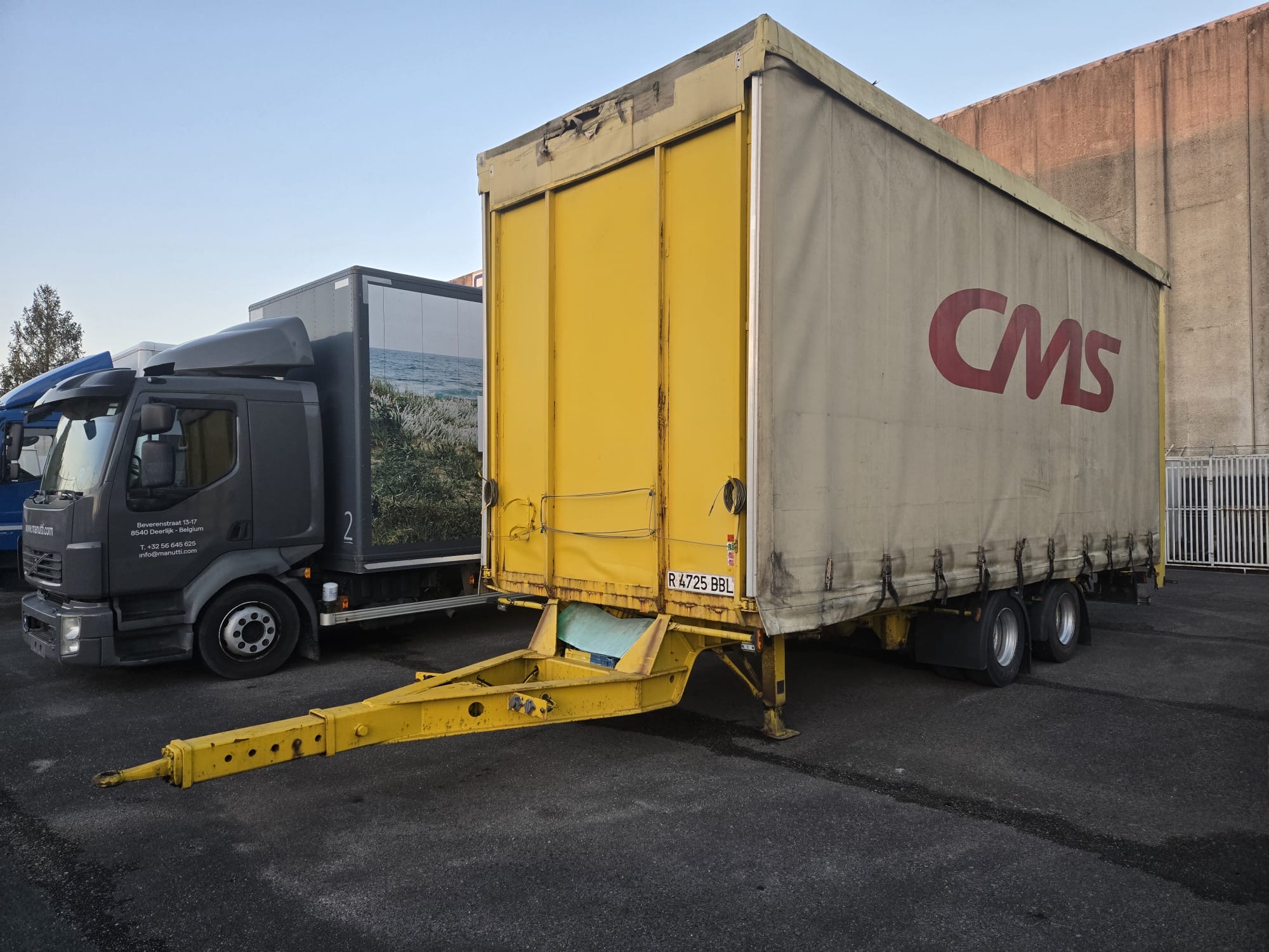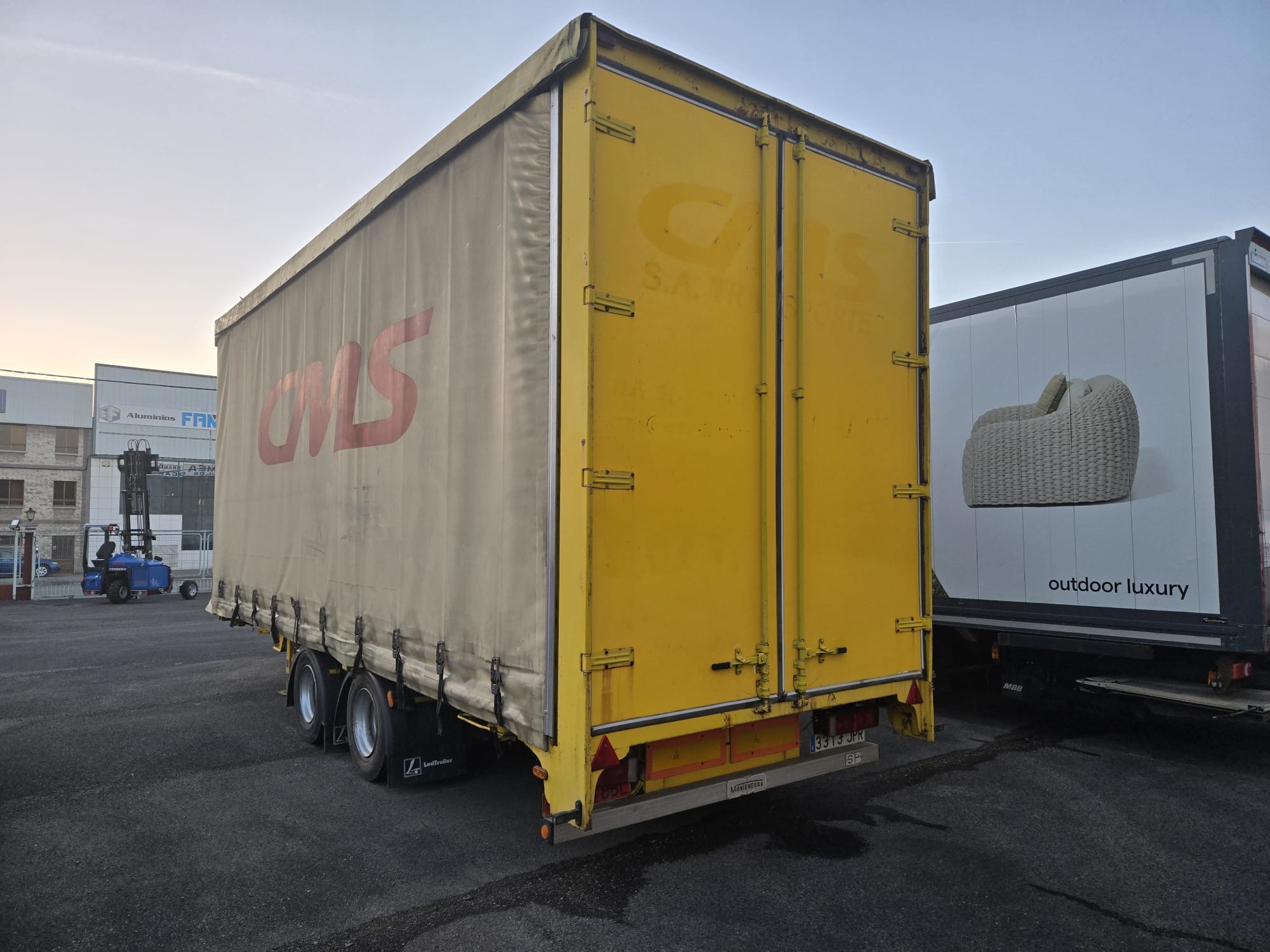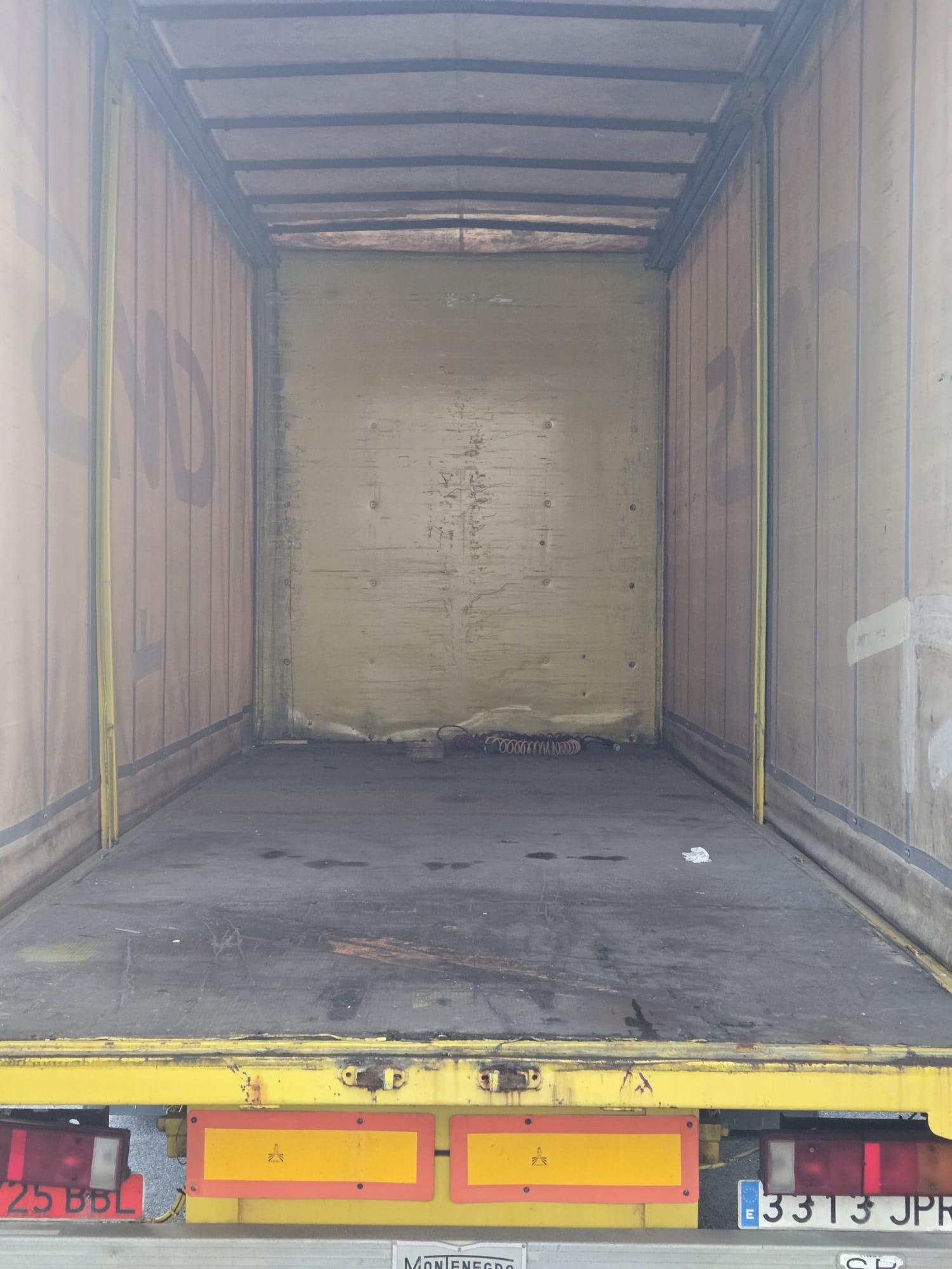 Carrocería portacontenedor, lonas laterales de corredera, techo fijo, piso de tablero finlandés, puerta trasera de dos hojas con cierre de fallebas.